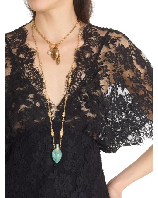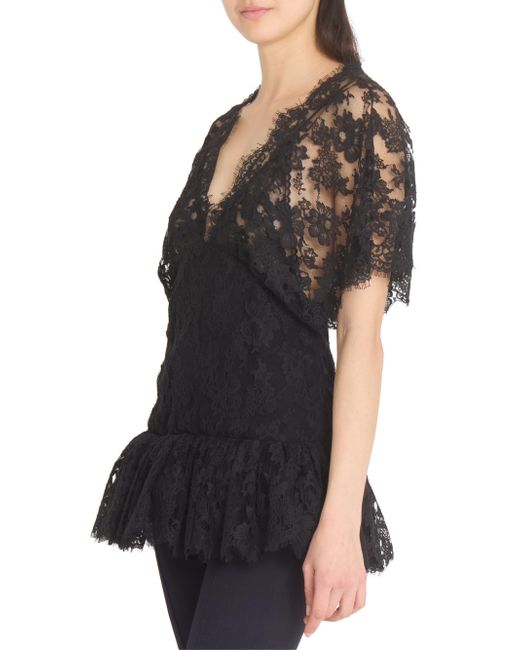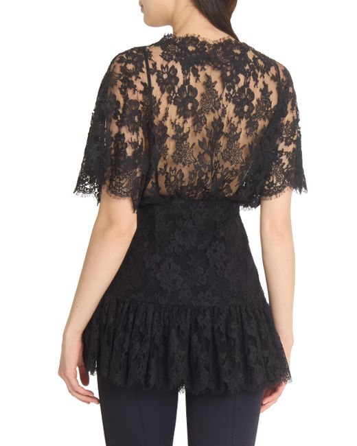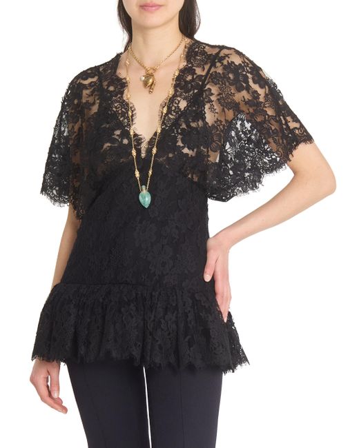 In this collection, Chloé's Creative Director Chemena Kamali channels a romantic, bohemian spirit by blending flowing lace, tiered silhouettes, and heritage tailoring with modern strength and layered femininity. The lineup embraces the tension between softness and structure, tradition and evolution, reflecting the multifaceted identities of today's women through a nostalgic yet forward-facing lens. Chloé's top is crafted of sheer floral lace and fitted through the waist. This style features a ruffled hem for playful shape and detail. V-neck Short sleeves Ruffled hem Side zip closure 54% cotton/46% viscose Dry clean Imported SIZE & FIT Model measurements: 5'10" tall Model is wearing a US size 4 ABOUT THE BRAND In 1952, founder Gaby Aghion established Chloé as an alternative to couture, and to appeal to the aspirations and empowerment of women. The label is now led by Creative Director Chemena Kamali, who furthers its signature aesthetic of cool, French-girl style. Advanced Designer - Chloe Rtw > Chloé > Saks Fifth Avenue. Chloé. Color: Black. Size: 2.