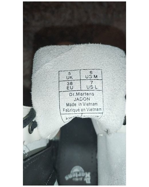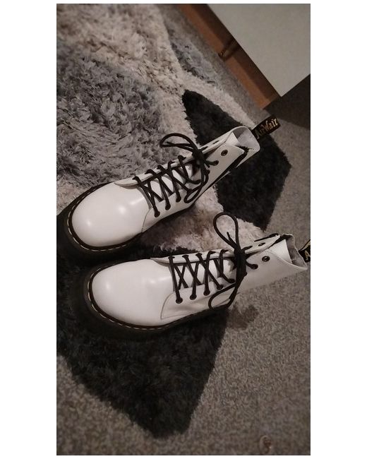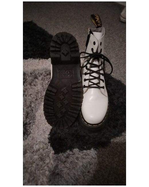 This is a pair of Dr. Martens Jadon women's platform boots in white leather, with a round toe shape and lace-up closure. They feature a 1.5 inch platform heel and ankle shaft style. The boots are a UK size 5 (US size 7) and have a standard calf width. The design includes accents of laces and a block heel style, with a classic theme perfect for casual wear in all seasons. Made by the brand Dr. Martens, these boots are a stylish and versatile addition to a woman's wardrobe.