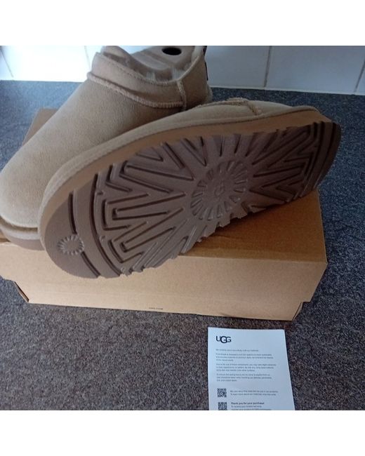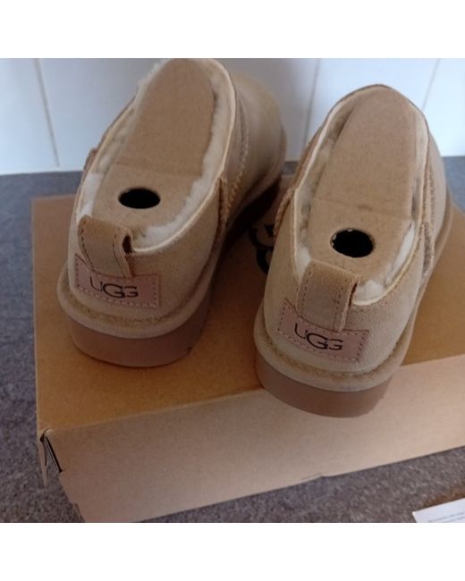 The Ugg Classic Micro Mini Boot in beige, size 4 UK, is a stylish and comfortable ankle boot perfect for casual occasions during the winter season. With a round toe, low heel, and sheepskin lining, these boots by UGG Australia offer both style and comfort. Made with suede uppers and a rubber outsole, these boots feature the signature UGG logo accent and are designed for women. The flat heel and standard shoe width make them perfect for all-day wear, while the wool insole adds extra warmth and comfort.