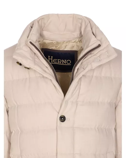beige high neck button closure zip fastening horizontal quilting welt pockets