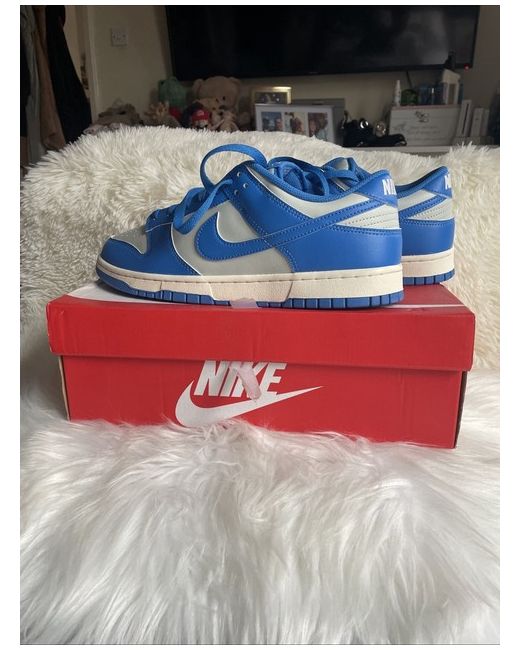 The Nike Dunks Low in size 10 are a stylish and comfortable low-top trainer with a lace-up closure. The shoes are designed for casual occasions and feature a fabric lining, overpronation support, rubber outsole, and leather upper material. Perfect for summer and basketball, these Nike Dunk Low sneakers in blue are a classic choice for men looking for both style and functionality in their footwear.