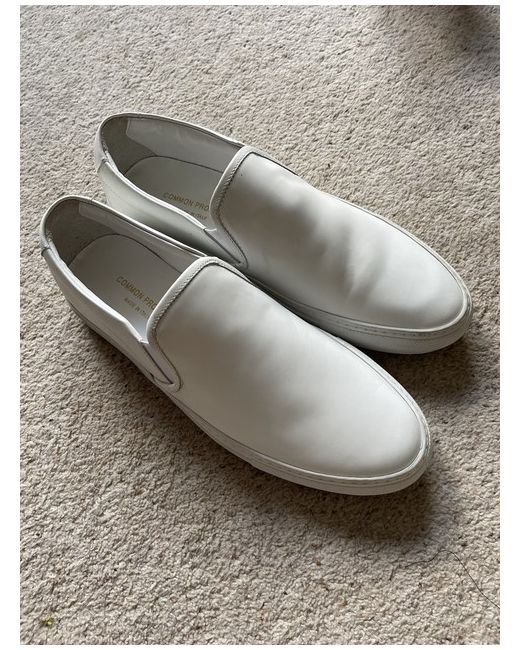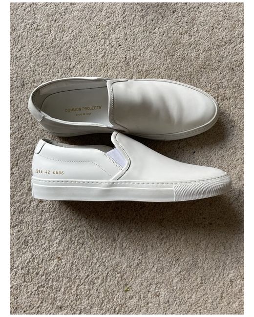 These Common Projects Men’s 1895 Premium Leather On Trend Slip On Trainers in white are a stylish and high-quality addition to any man's wardrobe. Crafted in Italy from premium leather, these sneakers feature a low top design and standard shoe width for a comfortable fit. Perfect for casual occasions in the summer season, these trainers are from the renowned COMMON PROJECTS brand and Achilles product line, making them a timeless and versatile choice for the fashion-conscious man. These are brand new, never been worn with only the slightest marks on midsole from transport… which is to be expected on premium grade soft white rubber. These usually retail for RRP £300+