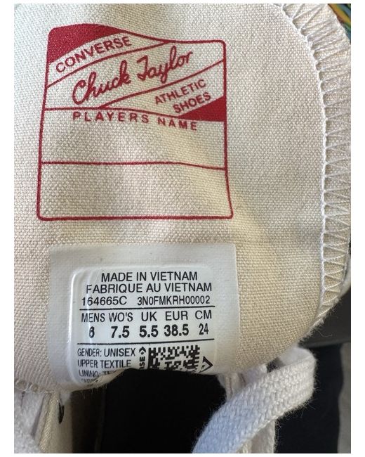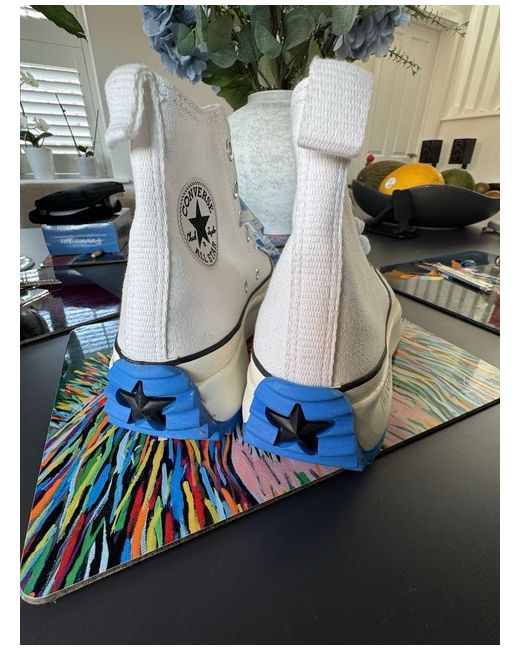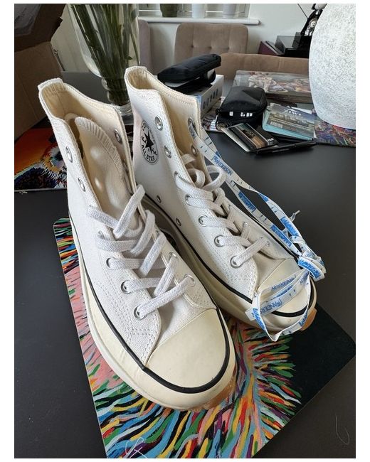 The Converse J W Anderson collaboration is a stylish high-top trainer in a classic white colour. Featuring a lace-up closure and standard shoe width, this shoe is perfect for casual occasions during the summer season. With a UK shoe size of 5.5 and US shoe size of 7.5, this sneaker is designed for men and combines the iconic Converse Chuck Taylor All Star Hi model with a contemporary twist. Made with a durable rubber outsole, this shoe is a fashionable and versatile choice for everyday wear. There is no box.