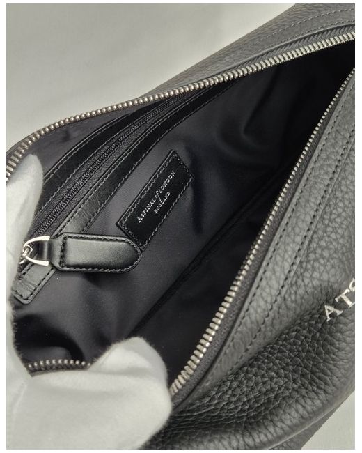 Aspinal Reporter Wash Bag. Interior zipped pocket. 24 x 12 x 11 cm. Silver-tone hardware. Hanging/carrying loop. Colour: black.