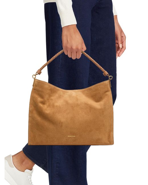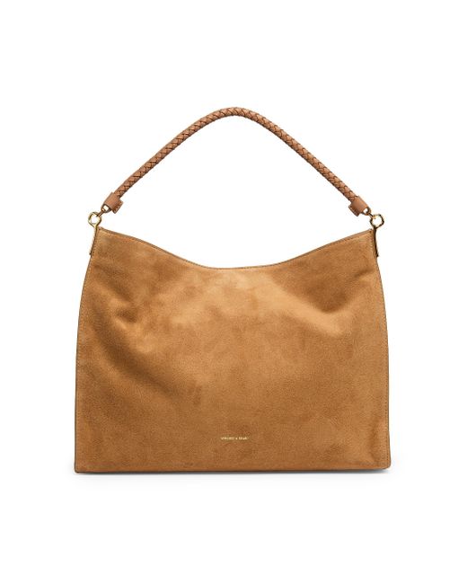 Crafted of suede, Veronica Beard's Vida slouch crossbody bag features a braided leather top handle and a removable, adjustable crossbody strap. Removable, adjustable crossbody strap Top handle Magnetic snap closure Interior: zip and slip pockets Leather Lining: polyester Trim: leather Imported SIZE About 14.25"W x 11"H x 3.25"D Strap: about 24.5" drop. Handbags - Collection Handbags > Veronica Beard > Saks Fifth Avenue. Veronica Beard. Color: Acorn.