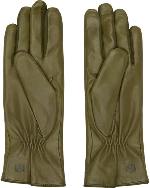 Grained nappa leather gloves. · Suede trim at fingers · Partially elasticized wrist · Notch at top wrist · Embossed logo at back wrist · Full knit cashmere-blend lining Supplier color: Olive