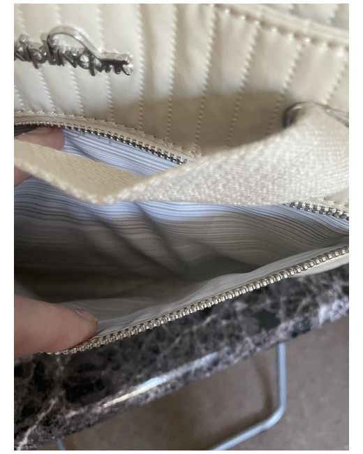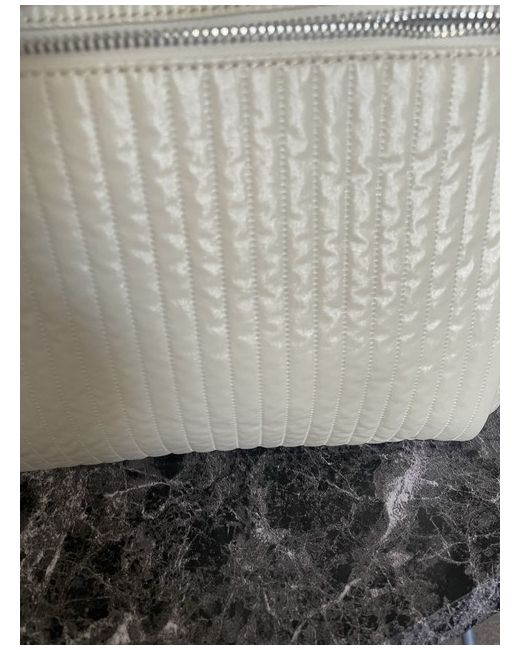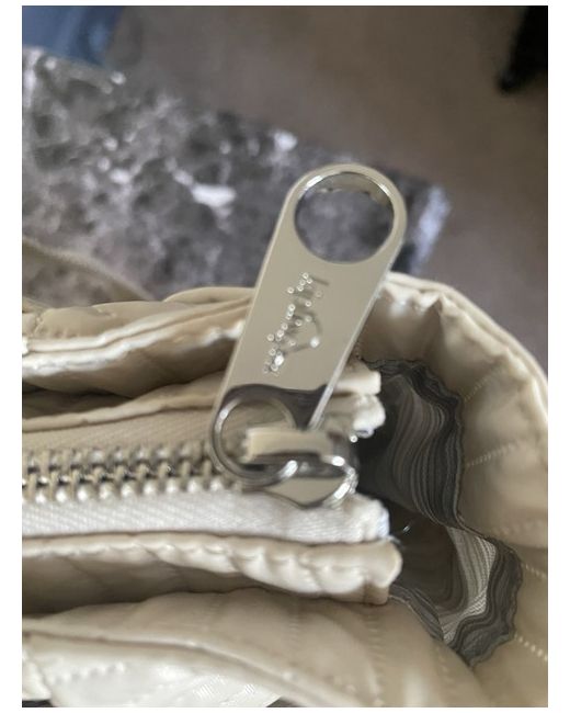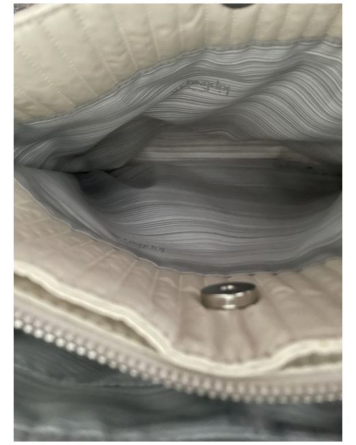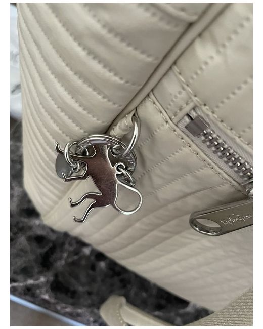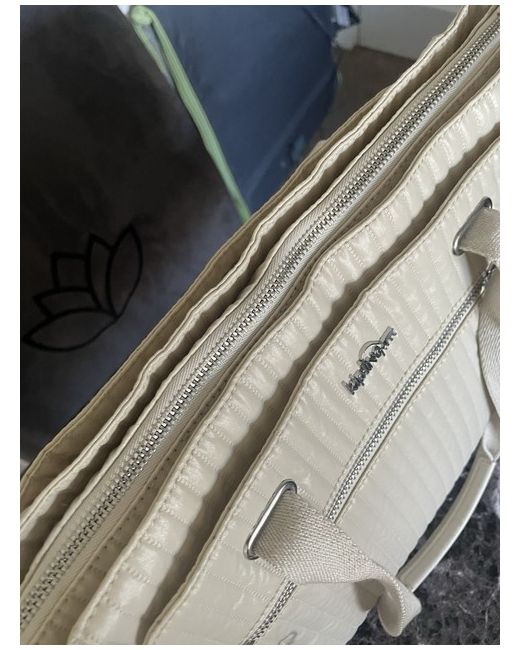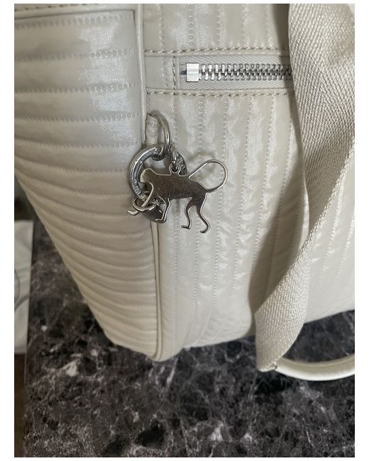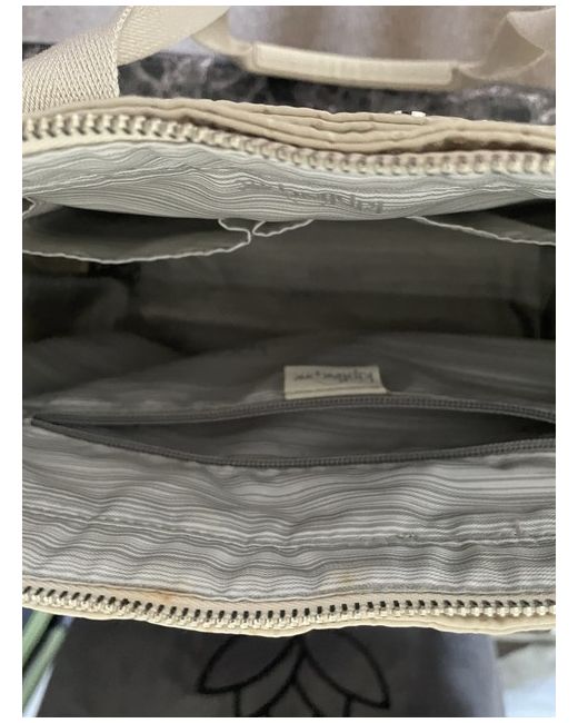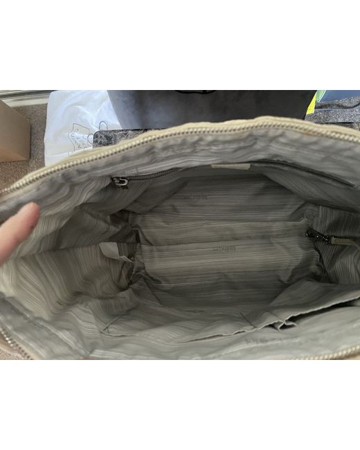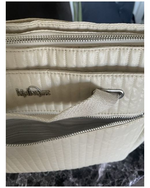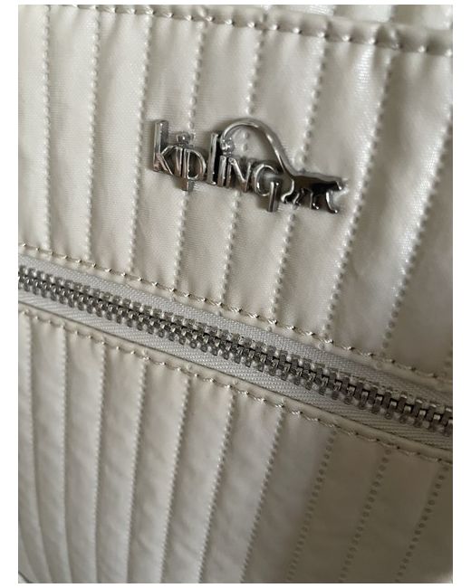 The bag features a zip closure, silver hardware, and a grey lining made of polyester. The exterior is made of polyester and nylon in a cream colour, with the Kipling logo as a customised detail. 2x pockets at both ends of bag big enough to carry a 500 ml bottle water.