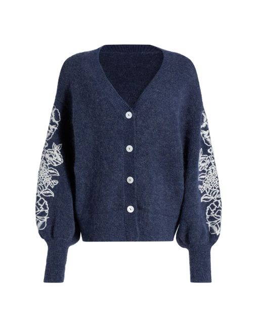 From Le Fleur Collection. Cut for an oversized fit, Aston Studio's Agnes cardigan is crafted of a mohair-wool blend and designed with contrast floral embroidery along the sleeves and rib-knit trim. V-neck Drop shoulders Balloon sleeves Rib-knit trim Button-front closure 33% mohair/33% wool/28% nylon/6% spandex Dry clean Imported SIZE & FIT Oversized fit About 22" from shoulder to hem Model measurements: 5'10" tall Model is wearing a US size 4. Contemporary Sportswear - Trend > Aston Studio > Saks Fifth Avenue. Aston Studio. Color: Royal. Size: 2.