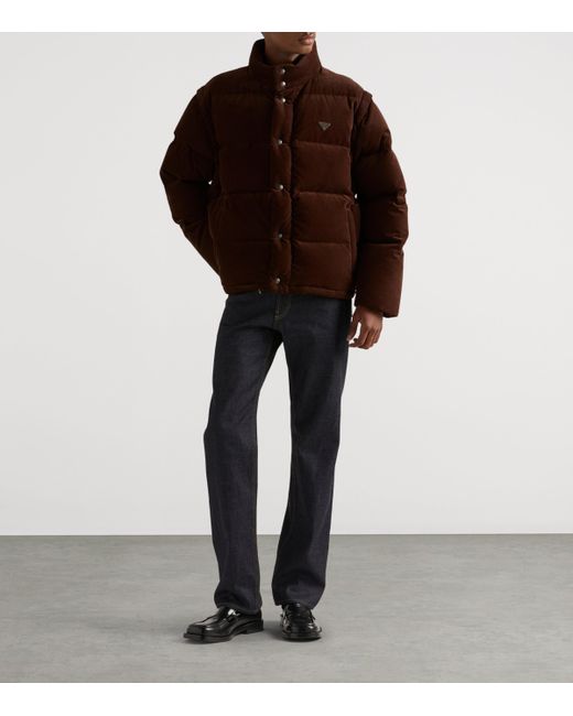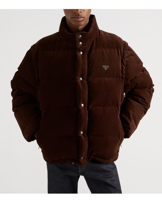 Built for brisk air and city nights, this Prada puffer reworks cold-weather outerwear through a corduroy lens. The plush, ribbed texture adds richness to every layer, while padded proportions and the signature triangle logo keep things grounded in the brand's distinct language of style and function.