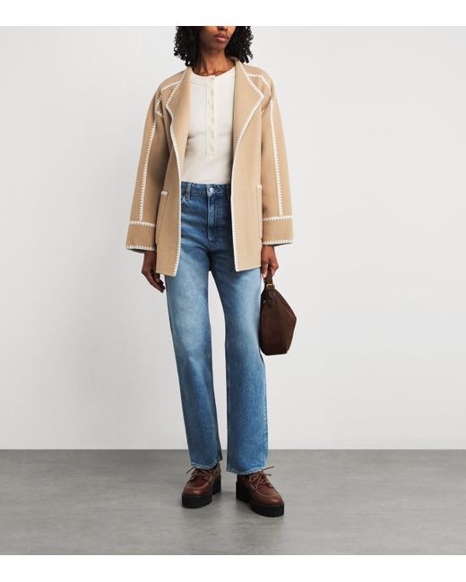 Approaching its transeasonal capsule, Maje seeks to give wardrobe staples a contemporary makeover. Musing on the cosy silhouette of a wrap style, this coat is cropped to a fresh, short form that's neatly outlined in contrast, pinked trims and secured with a belt to allow the boxy frame to be cinched to your liking.