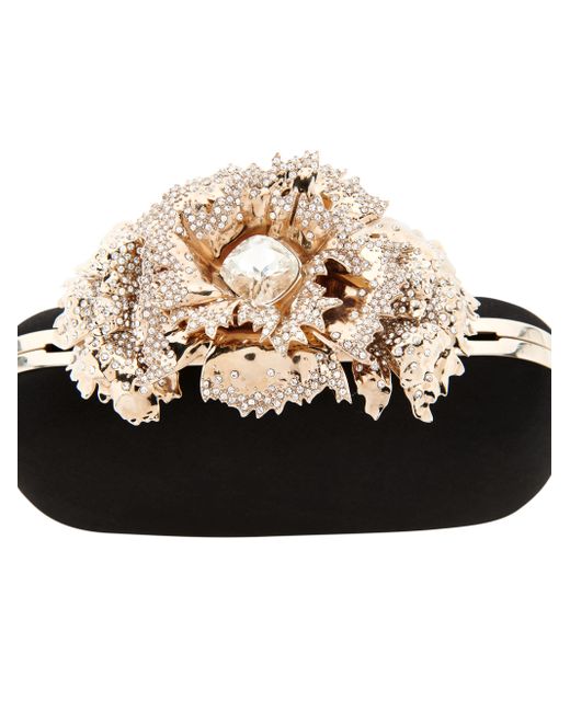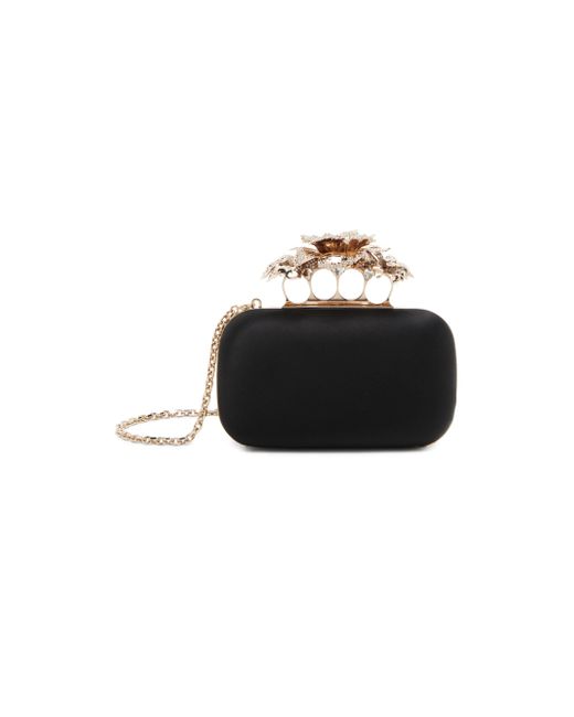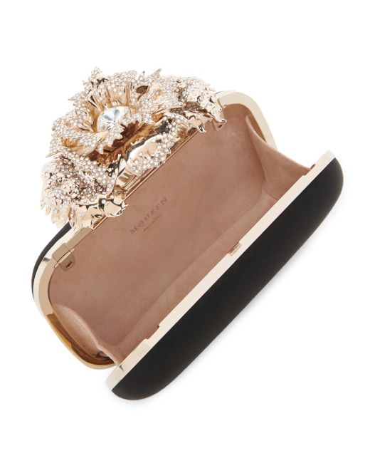 This Carnation clutch from McQueen, crafted of luxe silk, is detailed with crystal embellishments and the brand's iconic ring handle for an edgy statement. Removable chain shoulder strap Clasp closure Silk Made in Italy SIZE About 19"W x 10.5"H x 5"D ABOUT THE BRAND Visionary designer Lee Alexander McQueen launched his brand in 1992, which quickly became synonymous with cutting-edge, avant-garde design. Creative Director Seán McGirr has continued the designer's legacy, bringing precision craftsmanship and a feminine vision to the label's signature edge. Handbags - Alexander Mcqueen > Mcqueen > Saks Fifth Avenue. McQueen. Color: Black Gold.