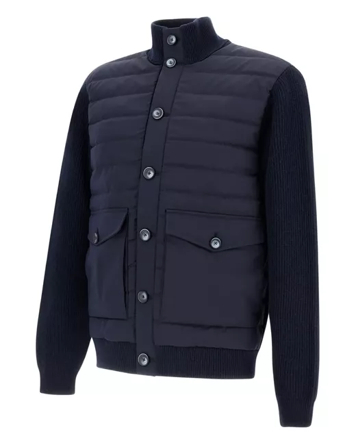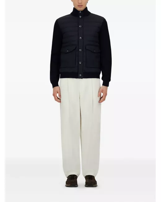 navy blue quilted long sleeves button front fastening front flap pockets high neck