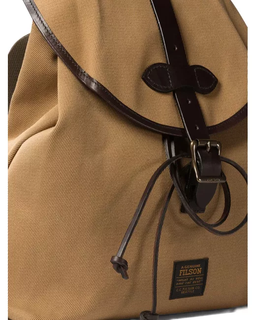 beige cotton leather trim drawstring closure buckle fastening adjustable shoulder straps