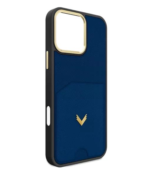 dark blue saffiano leather card pocket gold-tone logo black border camera cut-out