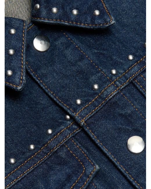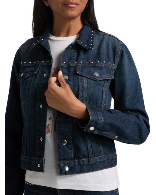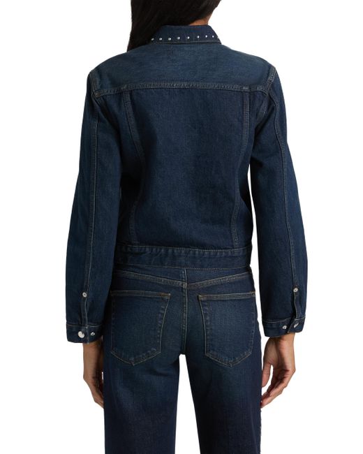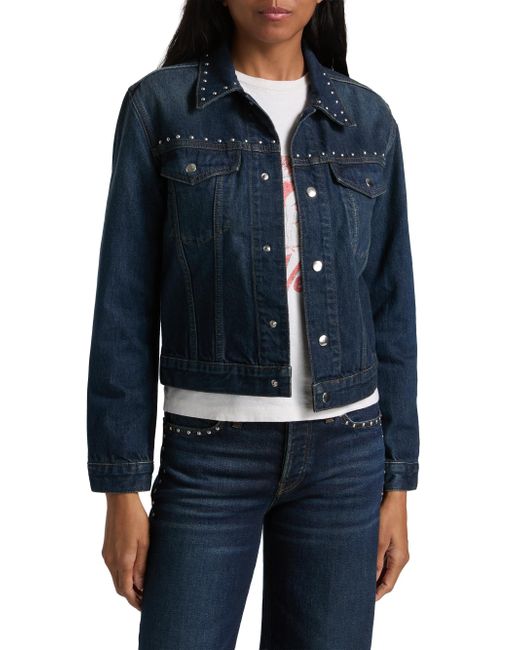 Crafted of cotton, Re/done's Baby denim trucker jacket is cut in a cropped silhouette featuring silvertone studded detailing. Spread collar Long sleeves Button-front closure 100% cotton Machine wash Imported SIZE & FIT About 21.25" from shoulder to hem Model measurements: 5'10" tall Model is wearing a US size small. Contemporary Sportswear - Denim And Bottoms > Re/done > Saks Fifth Avenue. Re/done. Color: Barely Worn Stud. Size: XS.
