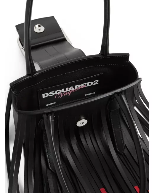 black foldover top with press-stud fastening two rolled top handles fringe detailing This piece comes complete with a protective dust bag.