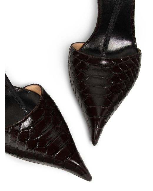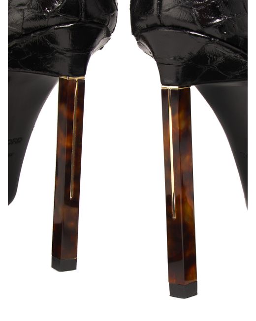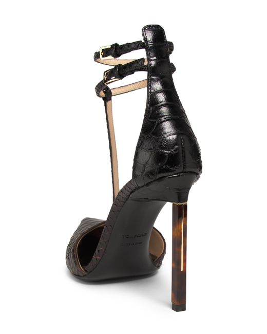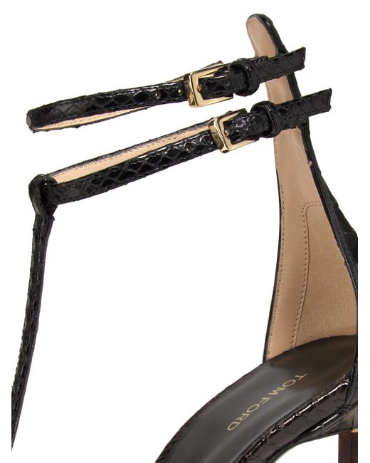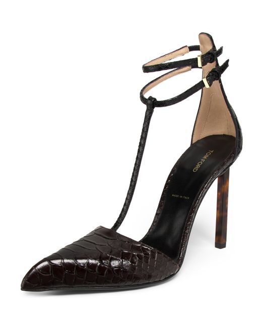 TOM FORD's strappy pumps feature python-embossed leather with a glossy finish, enhancing the sleek silhouette. This pair includes double goldtone buckles, a pointed toe, and a logo-stamped insole. Point toe Buckle closure Leather upper Leather lining Leather sole Made in Italy SIZE Heel: about 4.25" (110mm) ABOUT THE BRAND After 10 years of serving as the Creative Director for several international luxury fashion houses, Tom Ford launched his own line of optical frames, sunglasses and beauty in 2005. The following year he debuted menswear, and in 2010, women's ready-to-wear. His sleek, tailored aesthetic has since catapulted him to mega-brand status. Women's Shoes - European Designer Shoes > Tom Ford > Saks Fifth Avenue. TOM FORD. Color: Espresso Black. Size: 7.