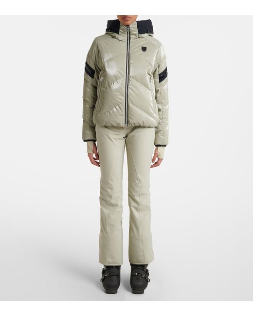 Material: 84% polyamide, 16% elastane. Care instructions: machine wash at 30 degrees. Made in China. Designer color name: Mineral Earth. Item color: gray. Filling: 100% polyester. Lining: 85% polyester, 15% elastane. Closure: zip and button fastening. Pockets: zipped pockets, back pockets. Zipped ankle cuffs. Elasticated ankle cuffs. Back waist tab. Adjustable tabs at the waist.