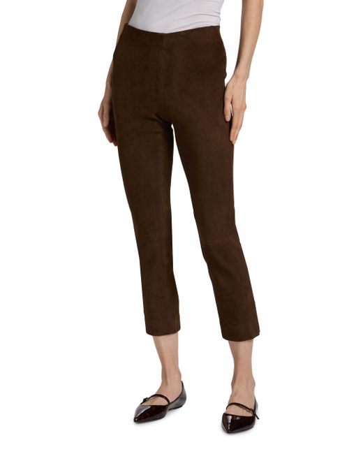 Crafted of supple suede, these cropped mid-rise pants from Vince are cut in a fitted silhouette and feature a split hem design. Elasticized waist Pulls on 100% suede Dry clean Imported SIZE & FIT Rise: about 8.5" Inseam: about 27" Leg opening: about 12.5" Model measurements: 5'10" tall Model is wearing a US size Small. Contemporary Sportswear - Vince > Vince > Saks Fifth Avenue. Vince. Color: Chocolate. Size: Large.