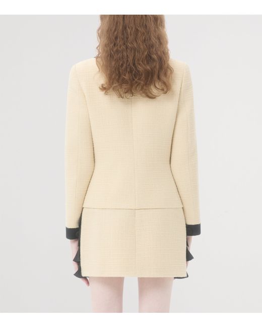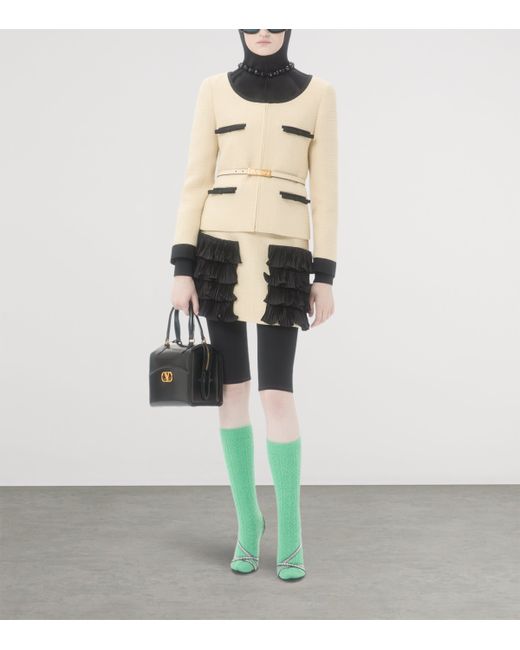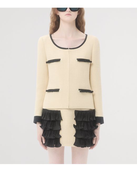 Shaping classic tailoring into poetry, this Valentino tweed jacket fuses structured, subtle hourglass lines with contrast trims and whimsical crepe bows that dance across the silhouette. Every seam, every bow feels like a dialogue between tradition and modernity, giving the jacket a sense of drama that captivates without shouting.