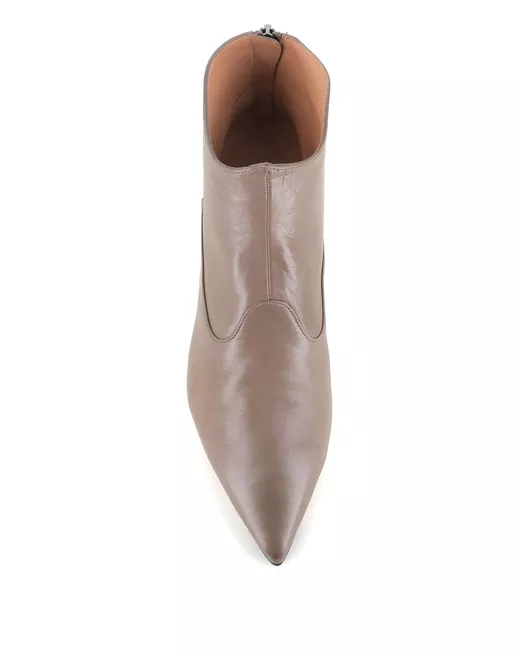 taupe leather upper pointed toe rear zip fastening kitten heel pull tab