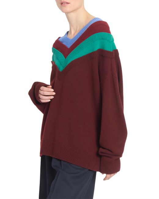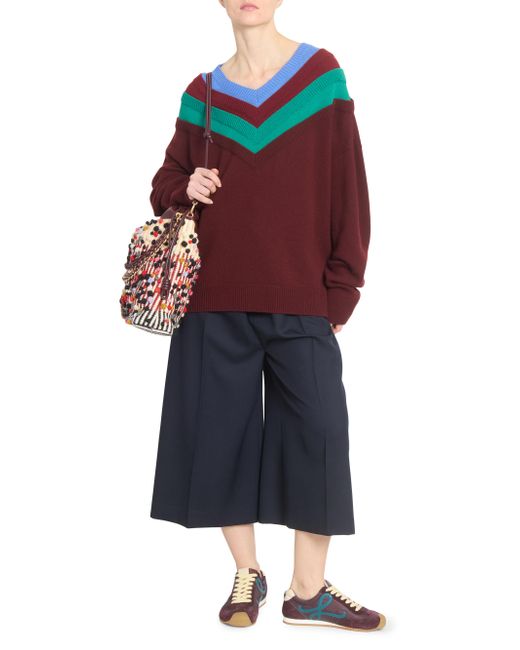 This rib-knit sweater from LOEWE is crafted of wool and features a colorblocked V-neck and drop shoulders. V-neck Drop shoulders Long sleeves Rib-knit trim Pulls over 96% wool/4% leather Dry clean Made in Italy SIZE & FIT Model measurements: 5'10" tall Model is wearing a US size Small ABOUT THE BRAND For over 179 years, LOEWE has been synonymous with classic luxury and expertise in fine leather and tailoring. The Spanish house's latest chapter hones in on redefining the craft through an intellectual-yet-playful approach to fashion. The line's bold and vibrant take on the Spanish lifestyle is infused in its effortlessly chic handbags, shoes, ready-to-wear and accessories for women and men. Advanced Designer - Loewe > Loewe > Saks Fifth Avenue. LOEWE. Color: Green Red Multicolor. Size: Small.
