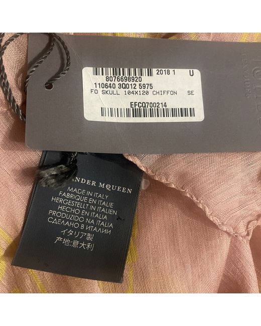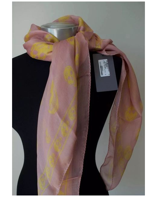 The Alexander McQueen 110640 Classical Skull Scarf in light pink and gold is a luxurious accessory for women. Made from chiffon silk in Italy, this shawl/wrap features a striking skull pattern, adding a touch of edginess to any outfit. The beautiful colour combination of light pink and gold gives this scarf a sophisticated and feminine look, making it a versatile piece that can be worn for various occasions. Perfect for adding a touch of glamour to a wardrobe.