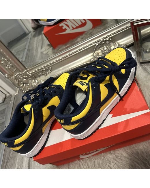 The Nike Dunk Low Unisex Trainers in UK shoe size 5.5 are stylish and comfortable sneakers perfect for casual occasions in the spring season. Featuring a yellow colour and a lace-up closure, these trainers are designed with a rubber outsole and leather upper material for durability. With a low-top shoe shaft style and standard shoe width, these Nike Dunks offer a trendy and versatile option for both men and women looking for a classic sneaker with a pop of colour.