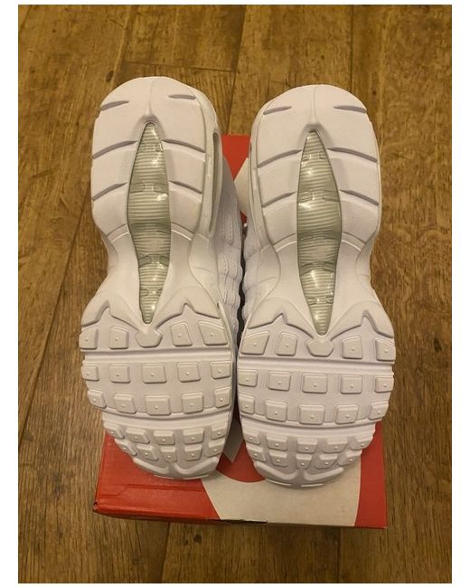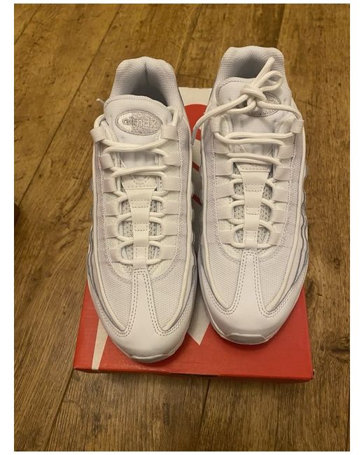 The product is a pair of Nike Air Max 95 trainers in a UK size 5.5. These white sneakers feature a low top shaft style with a lace-up closure, making them suitable for casual occasions during the summer season. With a rubber outsole and leather upper material, they offer comfort and durability. The Nike Air Max 95 model is a classic choice for women looking for a stylish yet practical shoe option.