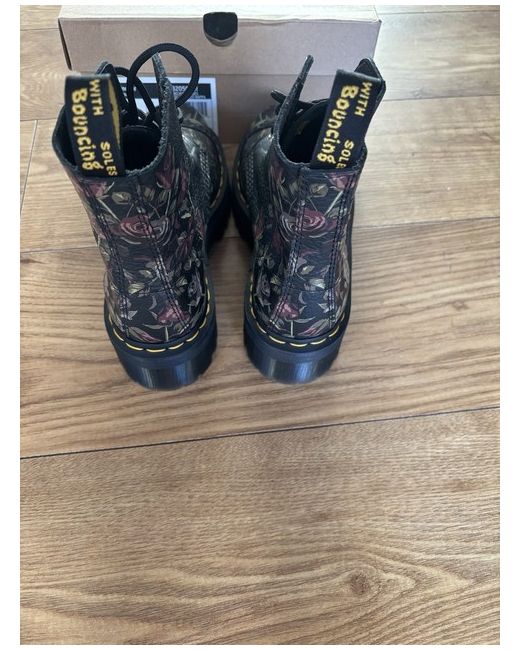 The Dr. Martens Women's Sinclair Decayed Roses Boots in UK size 5 are stylish ankle boots with a round toe shape and lace-up closure. The black leather boots feature floral lace accents and eyelets. With a platform style and leather upper, these boots offer a standard shoe width and are customised to suit the wearer. The unique design of the Dr. Martens Sinclair Decayed Roses model adds a touch of character to any outfit.