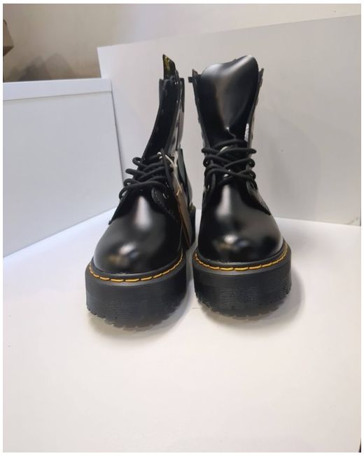 Dr Martens. platformboot is set on a towering Quad platform and complete with yellow welt stitching. Smooth Finish Vegan Leather.