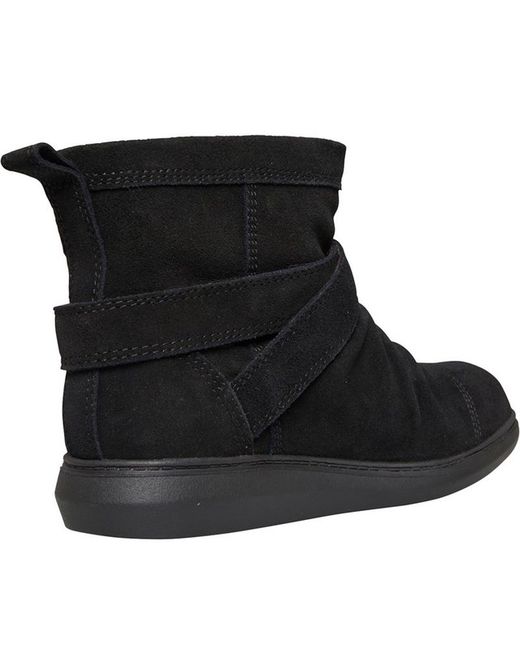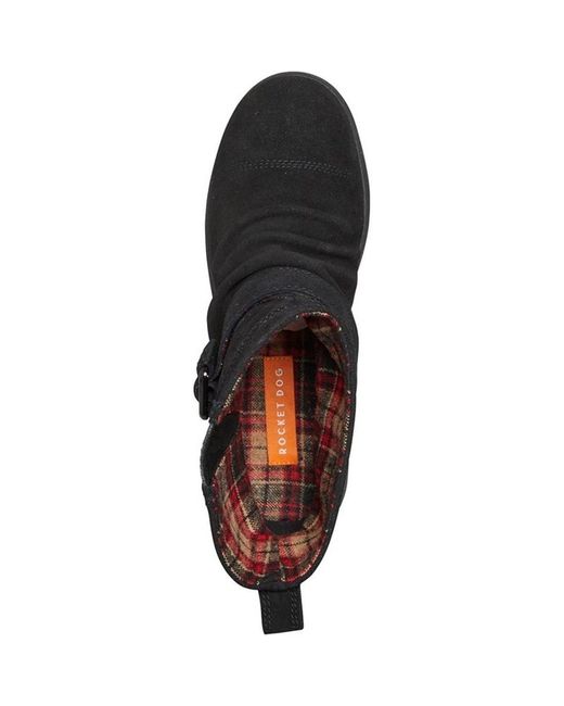 Rocket Dog Womens Mint Boots Black Rocket Dog soft suede ruched pull-on ankle boots with buckle strap fastening. Woven tab branding. Leather upper. Textile lining.