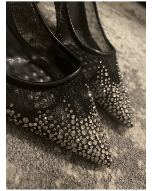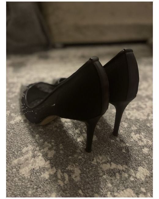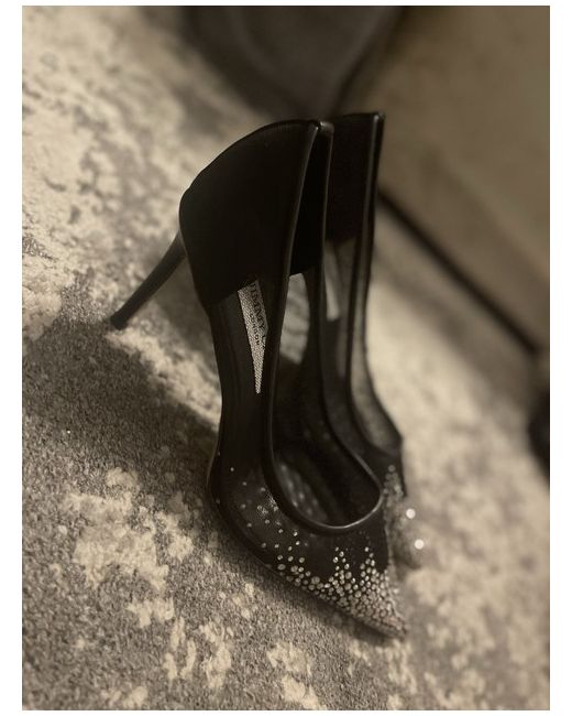 Add instant glamour to any outfit with these stunning black high heels. Crafted with a sheer, slightly shimmery fabric, these shoes feature a sleek pointed toe and a slim stiletto heel for a sophisticated silhouette. Sparkling rhinestones cascade from the toe in a beautiful gradient design, catching the light with every step.