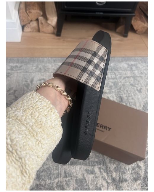 burberry sliders authentic and comes with box etc. Can answer any questions and send any more photos. Slight black mark on the top of the slider but can come off . Will send straight away or do collection. Cheapest price for buying them for £300+. Scannable code