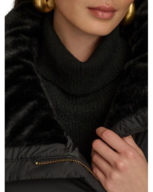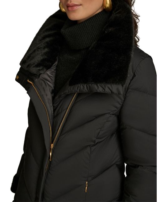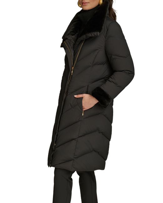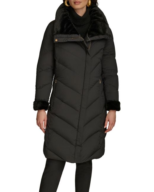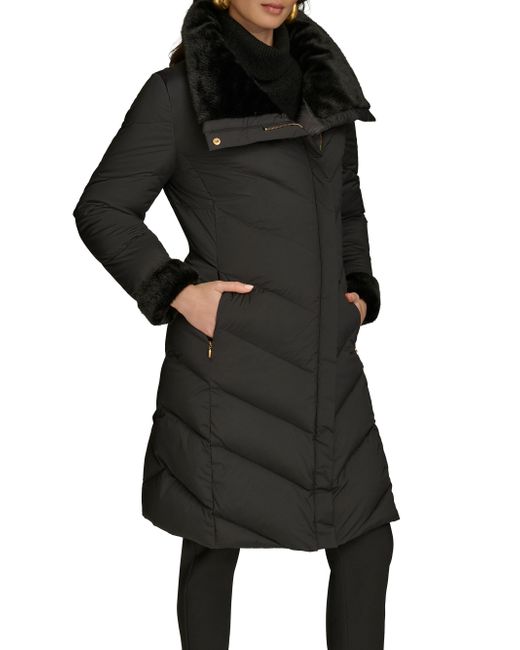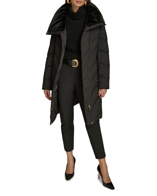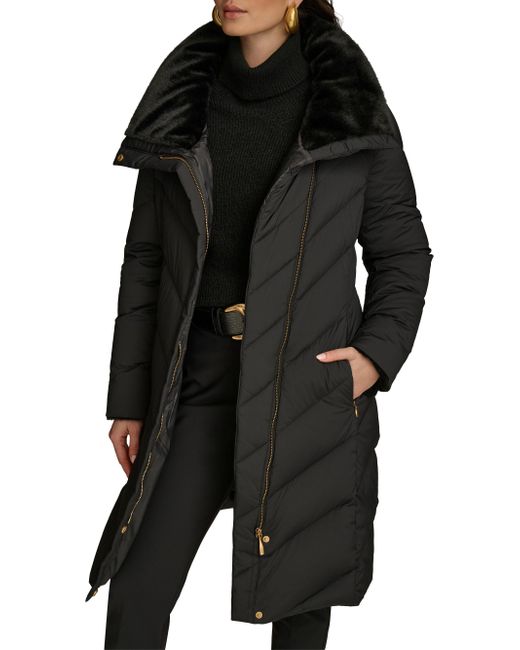 This down-filled puffer coat from Donna Karan is designed with chevron quilting and a convertible stand collar. Convertible stand collar Long sleeves Side slip pockets Front zip and snap closure 91% nylon/9% spandex Fill: down Machine wash Imported SIZE & FIT Model measurements: 5'10" tall Model is wearing a US size Small. Outerwear And Swimwear - Down > Donna Karan > Saks Fifth Avenue. Donna Karan. Color: Black. Size: Large.