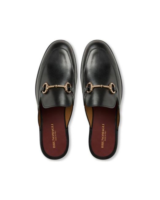 This is a sleek, backless black leather mule featuring a polished gold horse bit detail across the vamp. The loafer-inspired silhouette has a smooth, minimalist finish with clean stitching and a low heel, offering a sophisticated, slip-on style perfect for effortless elegance. The interior shows a hint of deep burgundy lining, adding a subtle contrast to the overall classic design. Ideal for both casual and refined looks.