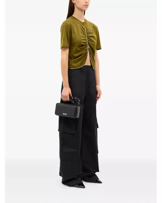olive green gathered detail zip fastening short sleeves round neck logo at the rear