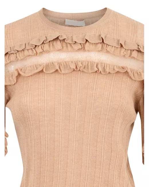 brown ribbed knit lace detail ruffled trim round neck half-length sleeves