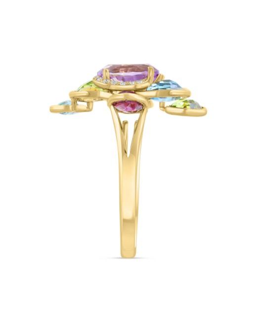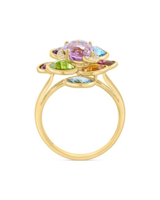 A diamond-framed pink amethyst is set amidst a dazzling glow of bezel-set gemstones in this stunning cluster ring from Effy. Gemstones include purple amethyst, blue topaz, citrine, peridot, and rhodolite.
