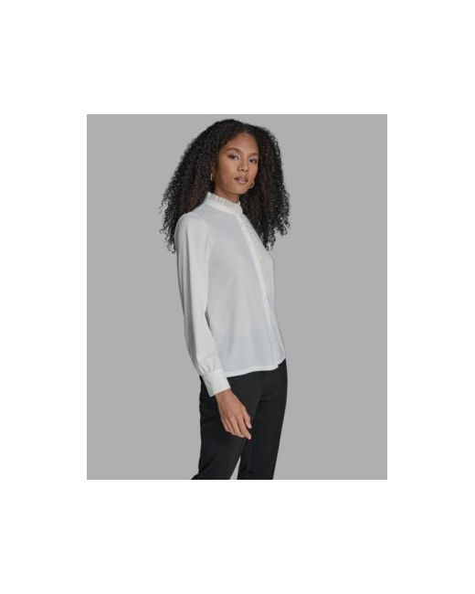 Delicate ruffles meet confident structure in this Bcbg long-sleeve blouse, featuring a graceful mock neck and tailored button-down front. Falling at the hips, it's a statement piece with subtle volume.