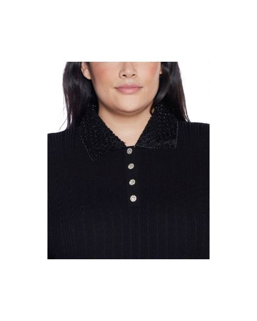 Cozy texture meets sparkling detail in this rib and cable sweater, styled with a half placket of four rhinestone buttons and a striking bead-adorned collar. Polished and chic, it's perfect for dressing up or pairing with jeans