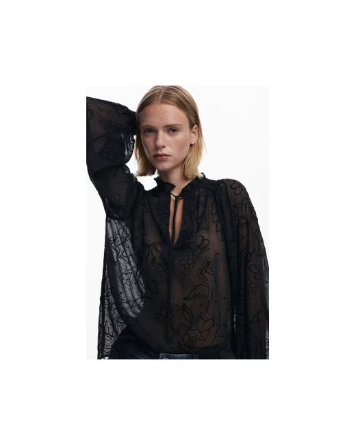 Flocked Velvet Dogtooth Sheer Tie Neck Blouse Small
