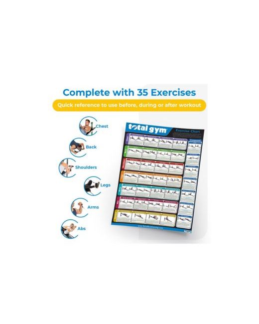 There's not always a fitness professional hanging around when you need them. When you need an immediate answer, refer to the Total Gym 24 x 36 Inch Convenient Quick Reference Exercise Chart.Complete with 35 exercises across multiple categories, this chart will be your new best friend before, during, and after a workout. The colored diagrams demonstrate exercises for your chest, back, shoulders, legs, arms, abs, stretch, and compound workouts that are sure to leave your body feeling stronger than ever. Mix and match exercises as you see fit to switch up your workouts or focus on specific areas. Using the number coding, you can easily match the chart with the Total Gym Training Deck for additional instructions. Measuring 24 x 36 inches, you can hang this guide on a wall or mirror in your home gym and refer to it when needed.Bring the professional to you with the helpful and handy Total Gym 24 x 36 Inch Convenient Quick Reference Exercise Chart.