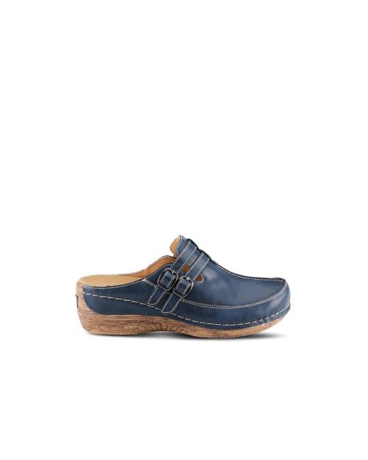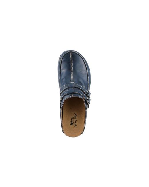 The Spring Step Happy clog blends rustic styling with supportive comfort for everyday wear. Crafted with high-quality leather and detailed with antique-finish buckles and contrast stitching, this slip-on offers timeless appeal. Inside, a soft textile lining and removable padded insole keep your feet cushioned and supported, while the polyurethane outsole delivers lightweight flexibility and stability. Designed with a rounded toe and a 2.25" heel, this clog is as stylish as it is functional.