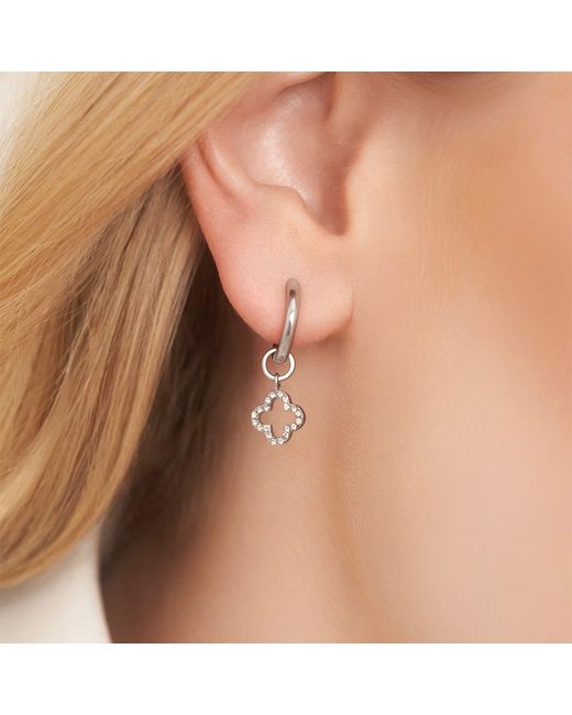 Handmade just for you, these silver clover huggie hoops are embellished with crystals to add a little sparkle to your ear party. Wear them alongside larger hoops, and add our clover necklace to tie it all together. Stainless steel and clear cubic zirconia stone, Silver Plated Two-year quality and plating guarantee Comes in luxury sustainable packaging Innovative anti-tarnish protective coating Water, sweat and heat-resistant Huggie hoop diameter: 11 mm Clover pendant: 6 mm