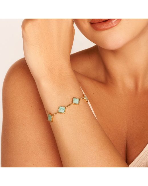 Blue Amazonite brings the wearer luck and success. That means this gold Multi Clover Bracelet inlaid with the stone will make the perfect gift for a graduate in your life.or anyone who needs a boost of good fortune. The stones in this piece are natural and unique so you might see slight variations in their colour. 18k gold-plated stainless steel Two-year quality and plating guarantee Comes in luxury recyclable packaging Innovative anti-tarnish protective coating Water, sweat and heat-resistant Made from over 60% recycled materials Available in two adjustable chain lengths: S/M (up to 9in) & M/L (up to 9.8in)