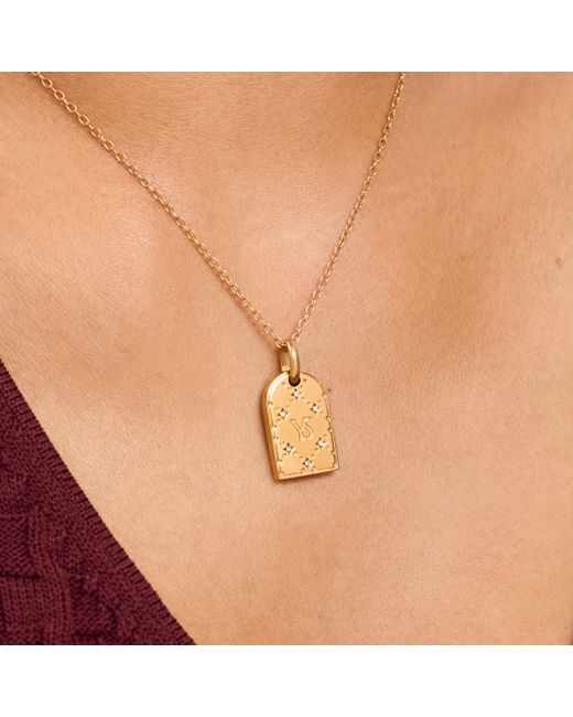 Plated in luxurious 18k gold, add your chosen initials to this statement tag necklace. Inspired by classic monogram designs, it blends timeless heritage style with a modern edge. Layer on our range of chains for a designer-inspired look that's uniquely yours. NEED TO KNOW 18k gold-plated stainless steel Five-year quality and plating guarantee Comes in luxury recyclable packaging Innovative anti-tarnish protective coating Water, sweat and heatproof Made from over 60% recycled materials Dimensions: 18.2mm x 11.8mm x 2.5mm Stones: Clear preciosa