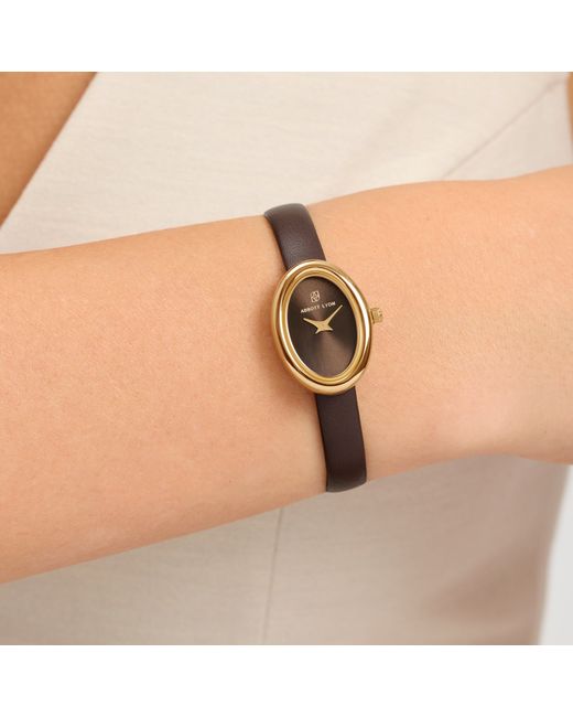Channel quiet luxury with this vintage-inspired mini oval watch. Pairing a sleek silhouette with a classic brown colourway, it's finished with a soft genuine leather strap and dainty dial details. Designed to elevate your everyday look, it'll take you from brunch to the boardroom in effortless style. NEED TO KNOW Strap: Soft, brown, fine-grain genuine leather - adjustable with buckle Movement: Quartz Seiko Movement Strap width: 8mm tapering to 7mm Case: 18K gold-plated brass, 25mm oval shape Water resistance: Case 3 ATM water-resistant Dial: Brown with Abbott Lyon logo Two-year quality and plating guarantee Comes in luxury recyclable packaging Bottom Strap: Approx length 105-110mm