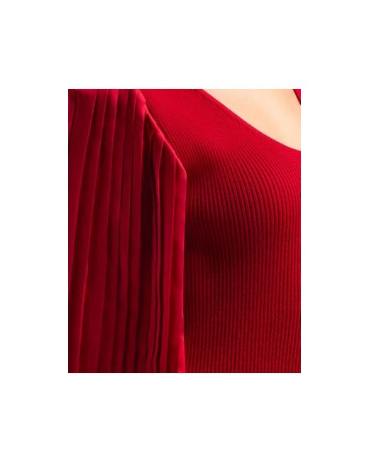 Women's Red V-Neck Pleated Sleeve Pull-On Sweater
