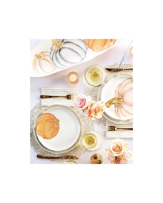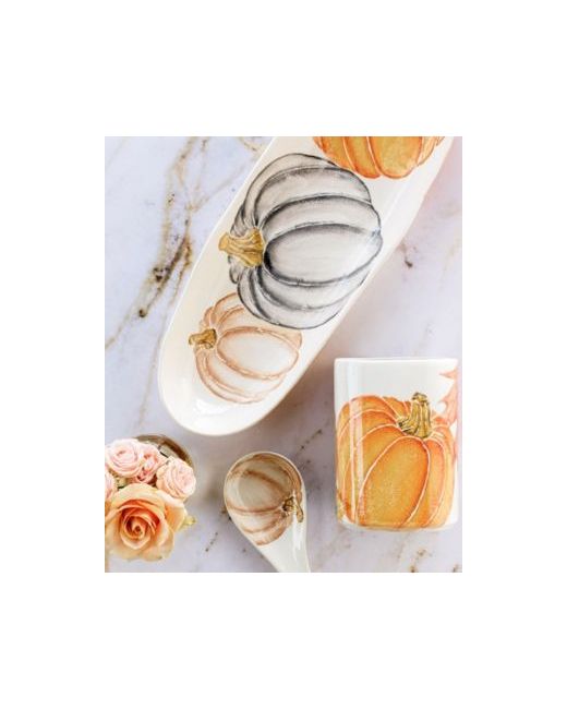 The Pumpkins Narrow Oval Platter captures the vibrant spirit of Florence's fall street markets. Hand sponged with care, each pumpkin stands out against a backdrop of crisp white. The playful yet sophisticated design celebrates the autumnal bounty, bringing a charming touch of the season to your kitchen.